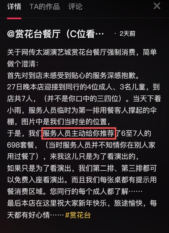 博主就不乐意了,是服务员让他们坐在这的,事先也没说有低消啊,现在距离打铁花开始就剩10分钟了,都点好菜了才说。
