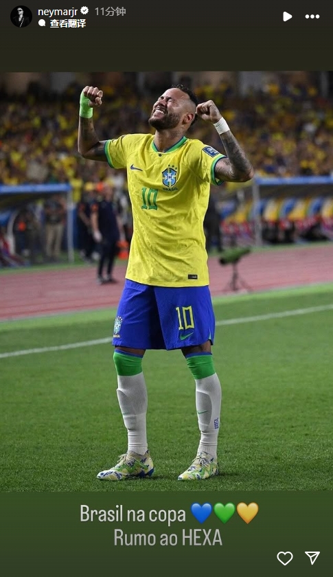 赛后,33岁的巴西队史射手王内马尔发文庆祝国家队出线,并表示将全力冲击第六座世界杯冠军。